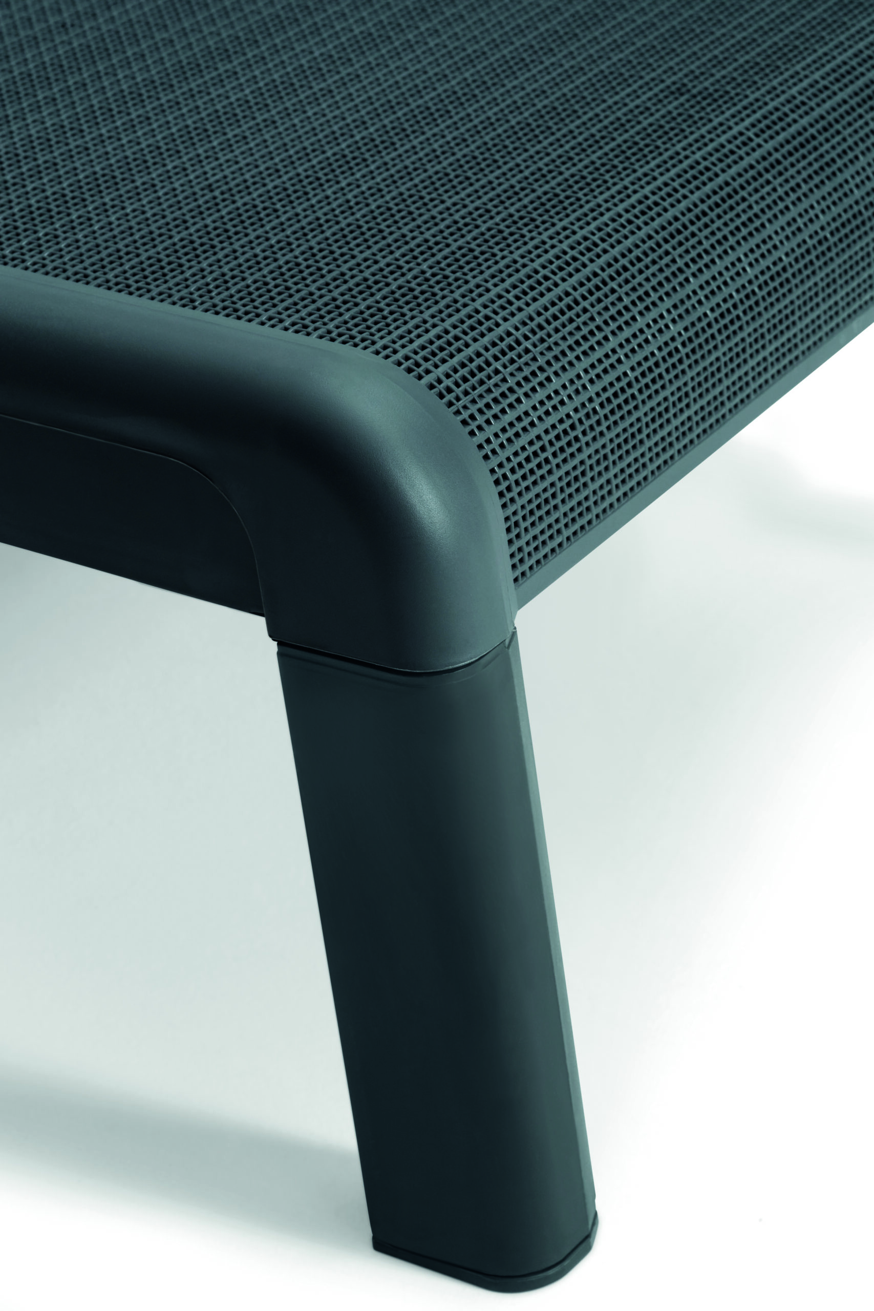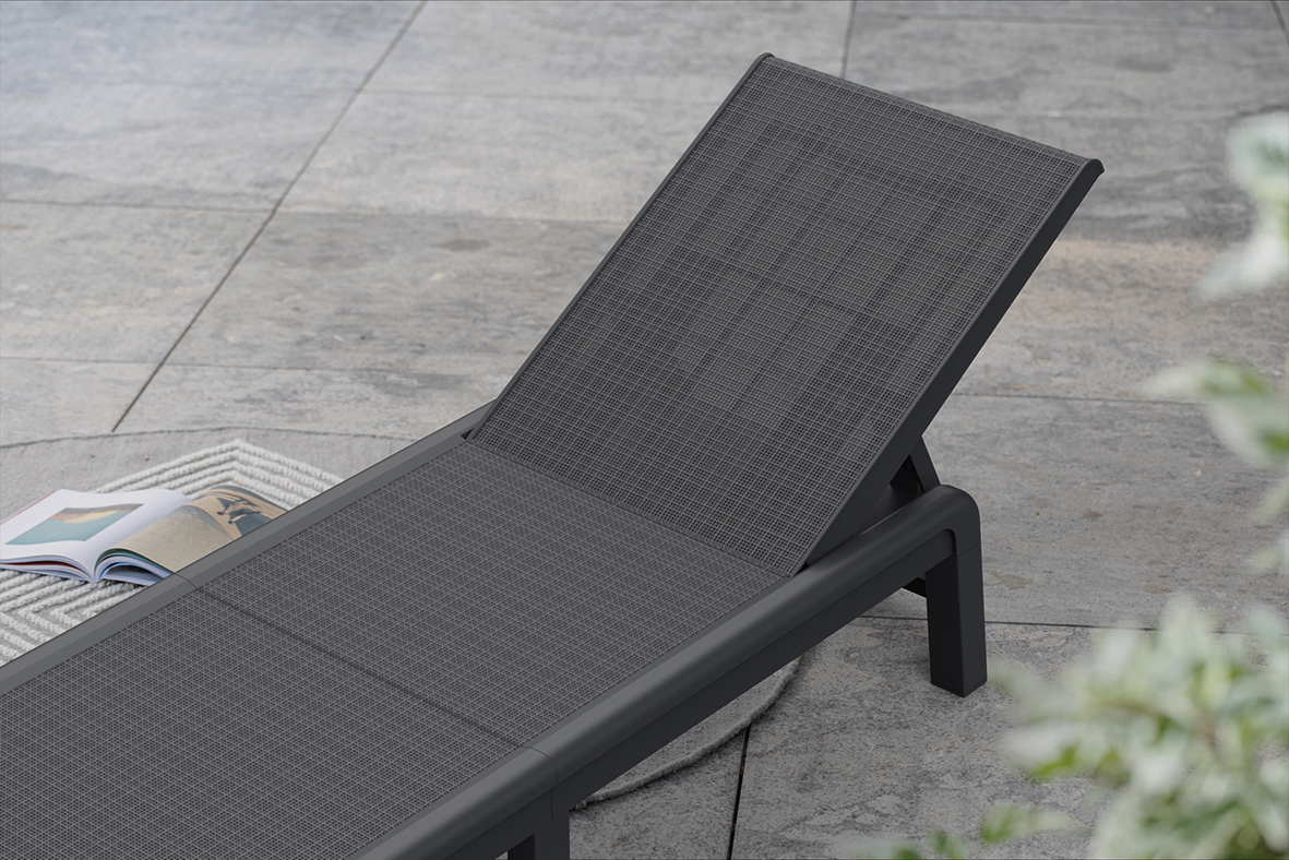 Siedzisko leżaka ma specjalną strukturę w stylu „juta”, która umożliwia swobodną cyrkulację powietrza. Dzięki temu powierzchnia pozostaje chłodna, zapobiegając poceniu się i nadmiernemu nagrzewaniu ciała w gorące dni. Materiał jest szybkoschnący i odporny na pleśń, co ułatwia użytkowanie i konserwację mebla nawet przy intensywnym kontakcie z wilgocią.