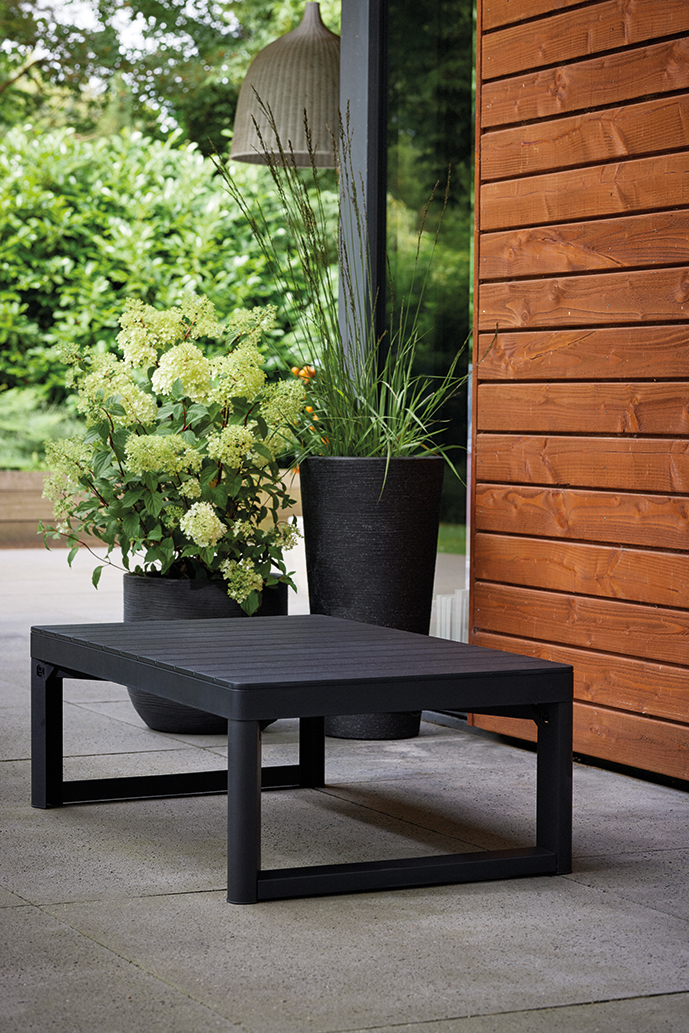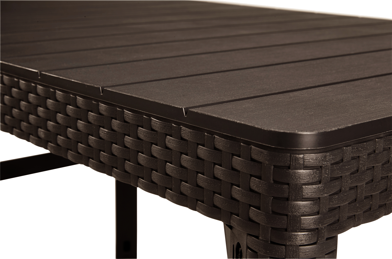 Połączenie nog o strukturze rattanu z blatowym efektem drewna tworzy harmonijną, nowoczesną i ponadczasową estetykę, która będzie pasować do różnorodnych aranżacji ogrodowych, tarasowych czy balkonowych.