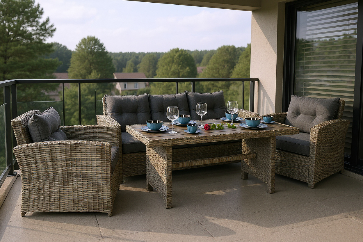 Choć zestaw został stworzony z myślą o użytku zewnętrznym, równie pięknie prezentuje się w nowoczesnych wnętrzach. Możesz ustawić go w jadalni, kuchni czy przestronnym salonie, tworząc elegancką strefę relaksu. Jego design w kolorze cappuccino wpasuje się zarówno w klasyczne, jak i nowoczesne aranżacje.