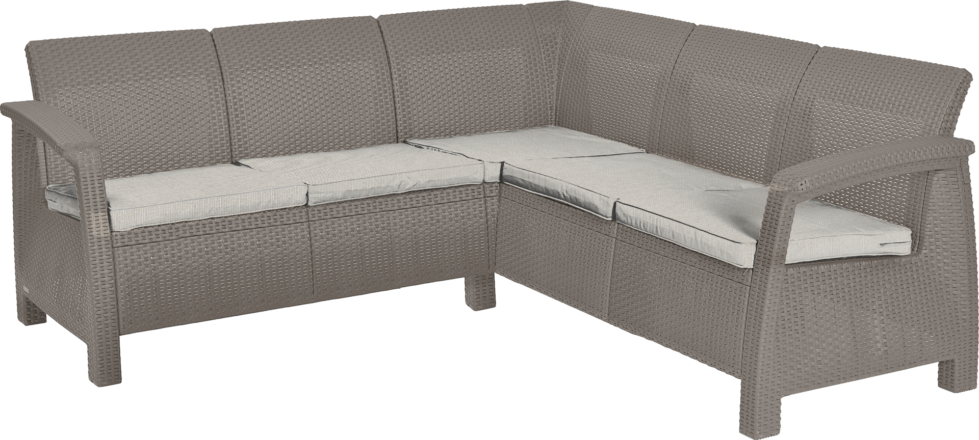 Narożnik Corfu Relax wykonano z wytrzymałego polipropylenu o strukturze imitującej rattan. Materiał ten wyróżnia się odpornością na promieniowanie UV, deszcz, wilgoć oraz zmienne temperatury, dzięki czemu mebel nie wymaga impregnacji ani specjalnego czyszczenia – wystarczy wilgotna ściereczka. Filtry UV zapewniają, że kolor cappuccino narożnika i poduszek pozostaje intensywny przez długi czas. Meble Keter z serii Corfu sprawdzają się doskonale zarówno w ogrodzie, jak i we wnętrzach, zachowując estetykę i funkcjonalność przez wiele lat.