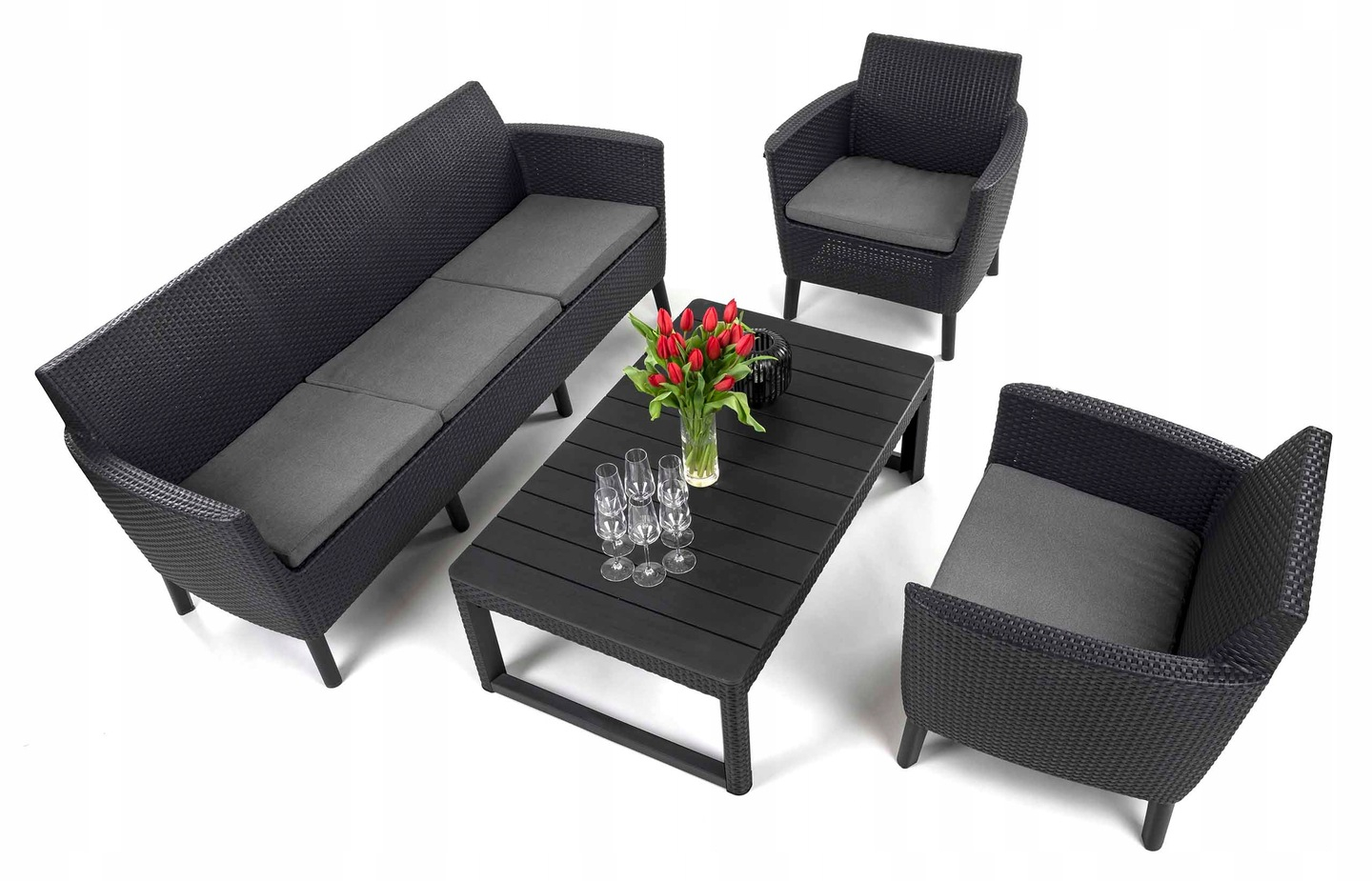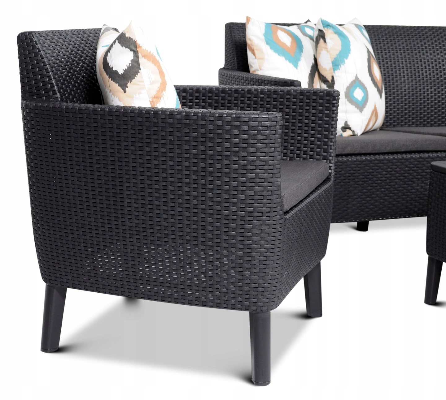 W centrum zestawu znajduje się sofa ogrodowa, zaprojektowana z myślą o maksymalnym komforcie i wytrzymałości. Jej nowoczesna forma, delikatna struktura przypominająca ręcznie pleciony rattan i grafitowy kolor tworzą elegancki, ponadczasowy wygląd. Sofa bez problemu pomieści trzy osoby, a dzięki głębokiemu siedzisku i ergonomicznemu oparciu zapewnia pełen relaks po dniu spędzonym na świeżym powietrzu. Wykonana z odpornego na warunki atmosferyczne polipropylenu, nie wymaga impregnacji ani konserwacji. Meble ogrodowe SALEMO to gwarancja wygody i trwałości przez wiele sezonów.