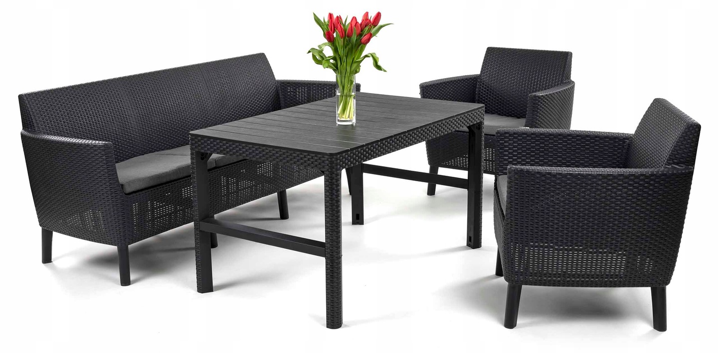 Zaprojektuj idealną strefę relaksu z wyjątkowymi meblami ogrodowymi w eleganckim odcieniu grafitu. To kompletny zestaw mebli dla 5 osób, który doskonale sprawdzi się w ogrodzie, na tarasie czy przestronnym balkonie. W skład kompletu wchodzi wygodna sofa trzyosobowa, dwa komfortowe fotele oraz stolik LYON z regulacją wysokości blatu, który może pełnić funkcję stolika kawowego lub jadalnianego. Grafitowy komplet mebli ogrodowych to połączenie elegancji, trwałości i wygody użytkowania – idealne rozwiązanie dla osób, które cenią styl i praktyczne detale w jednym.