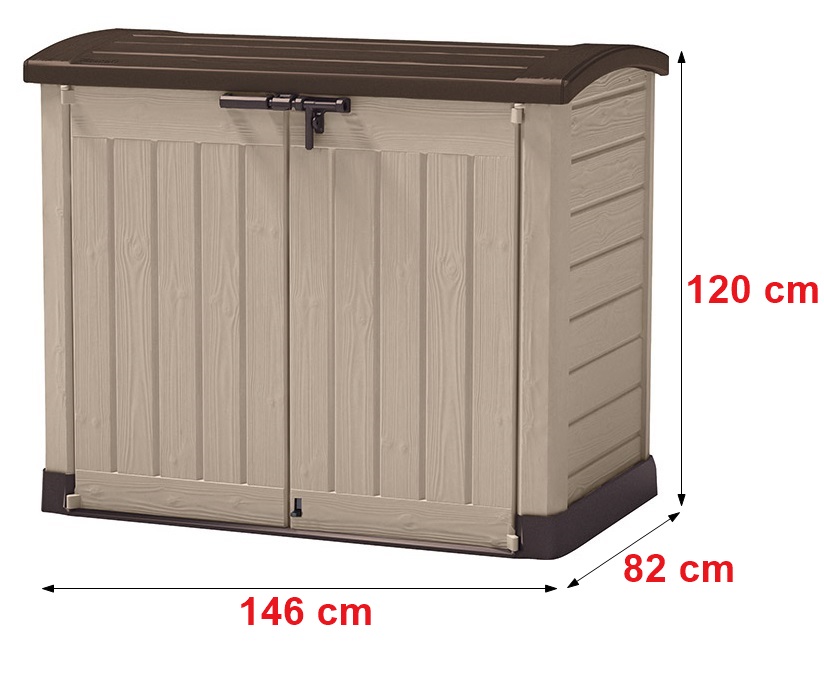 - Pojemność aż 1200 litrów – idealny do przechowywania koszy na śmieci, narzędzi ogrodowych, akcesoriów tarasowych, zabawek, poduszek i sprzętów sezonowych.