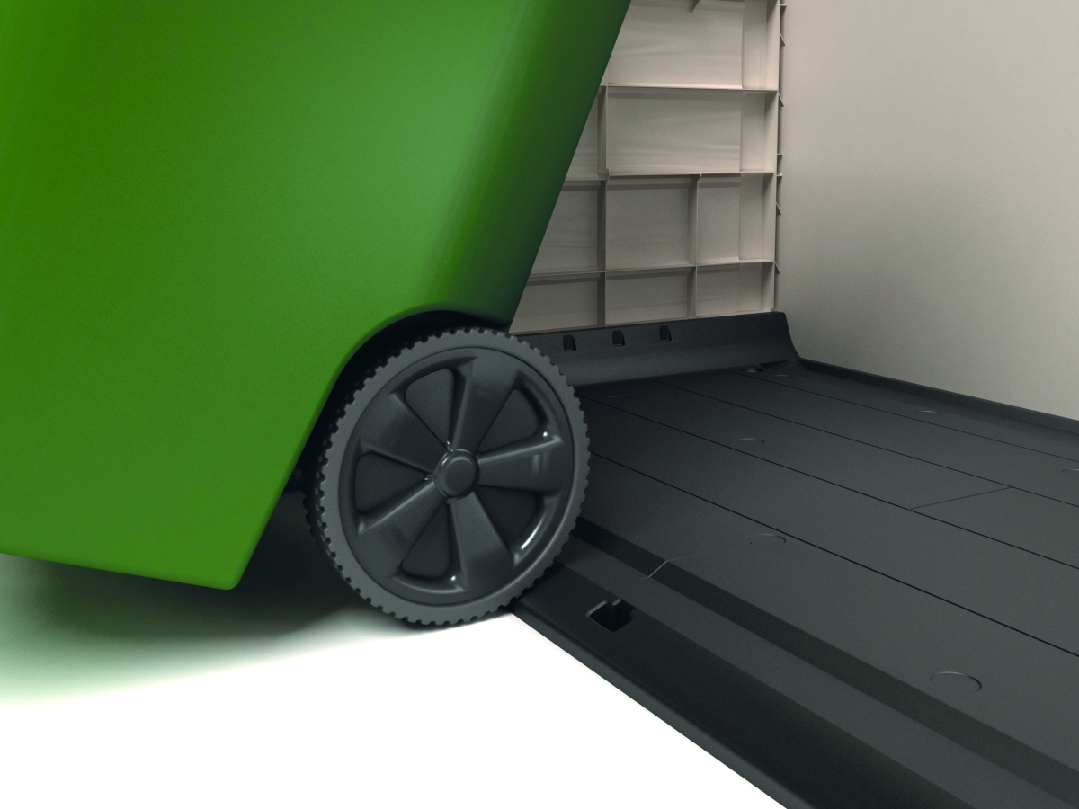 - Solidna podłoga chroniąca zawartość – odporna na błoto, wodę i gryzonie. Obniżony i pochylony próg ułatwia wstawianie pojemników na kółkach.
