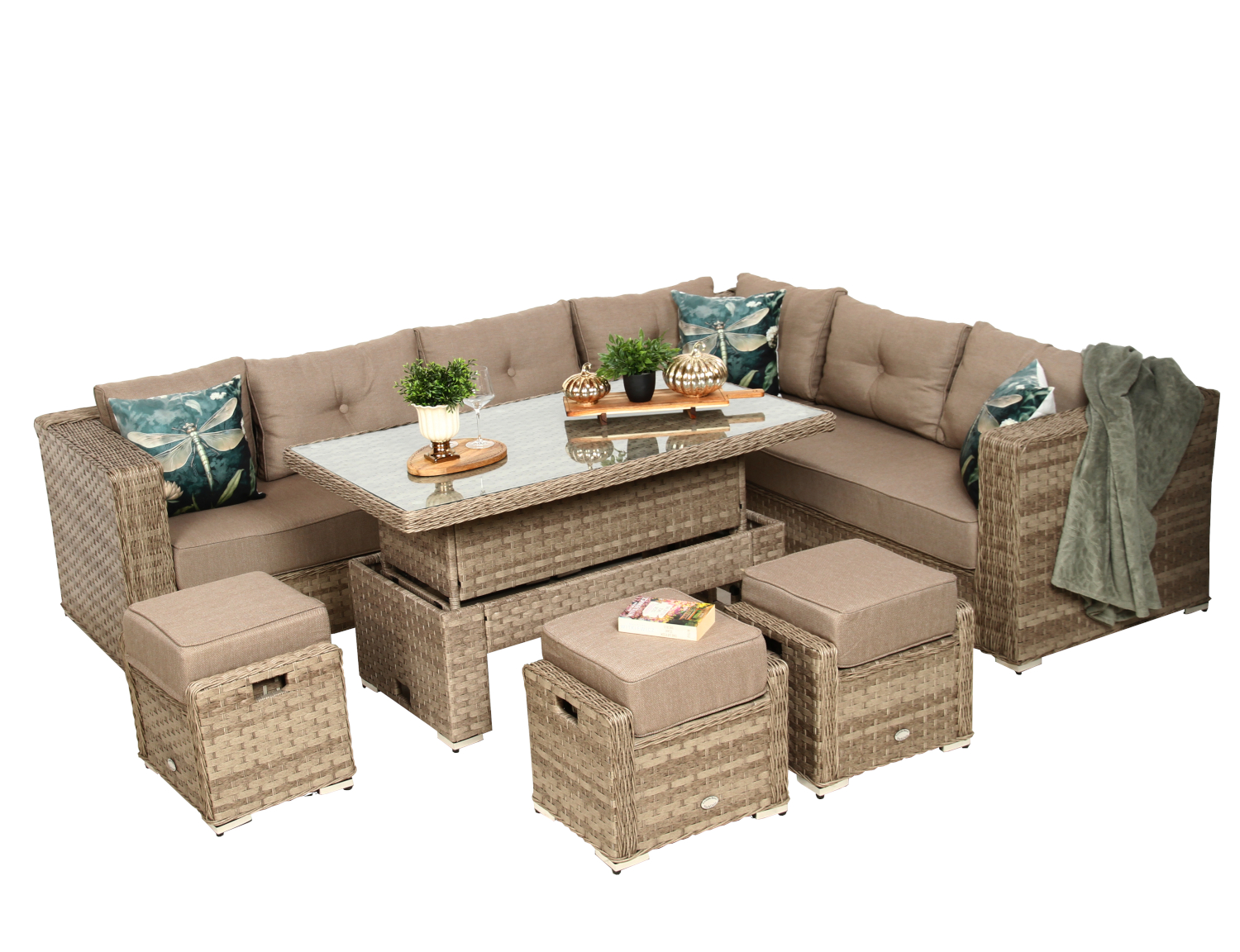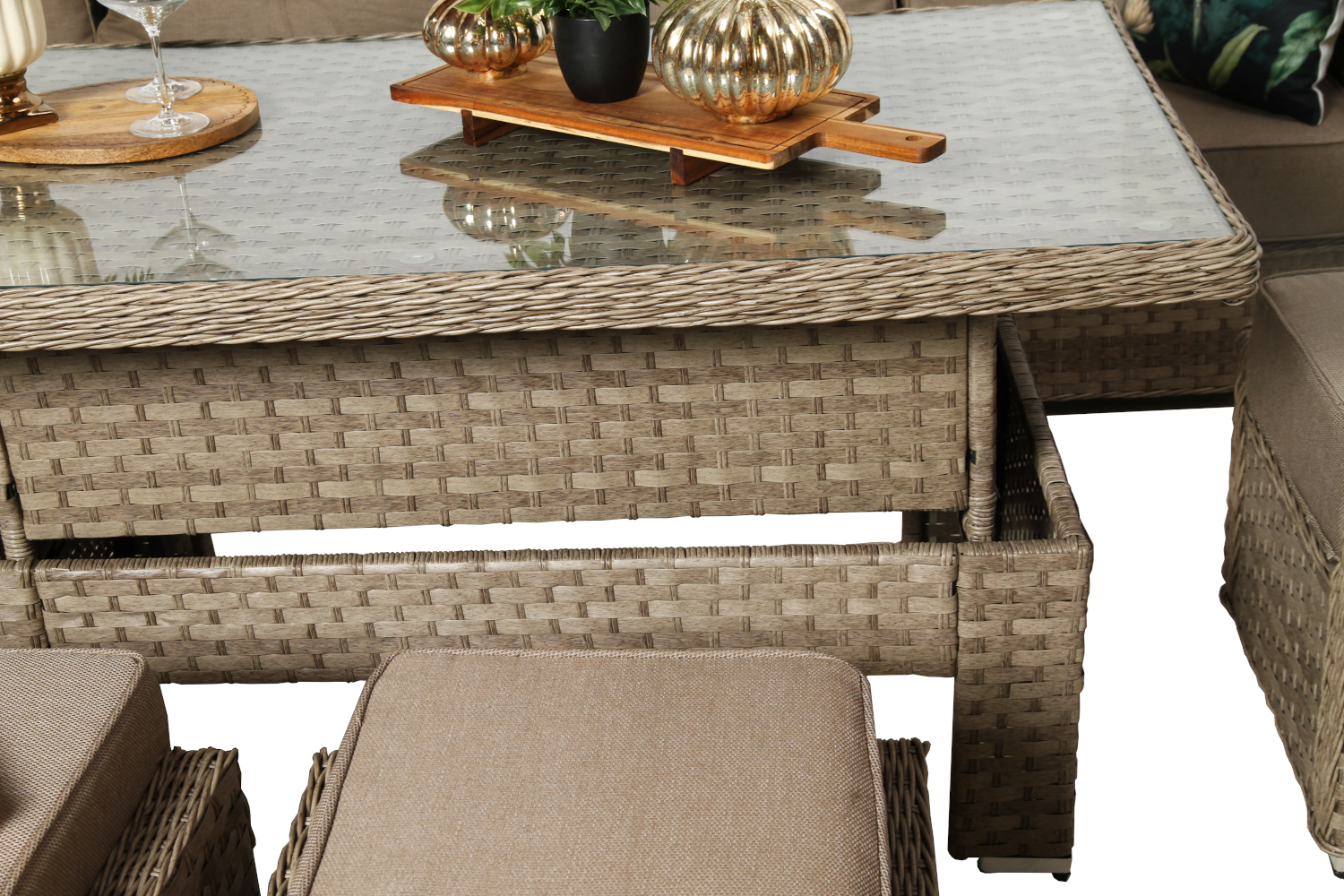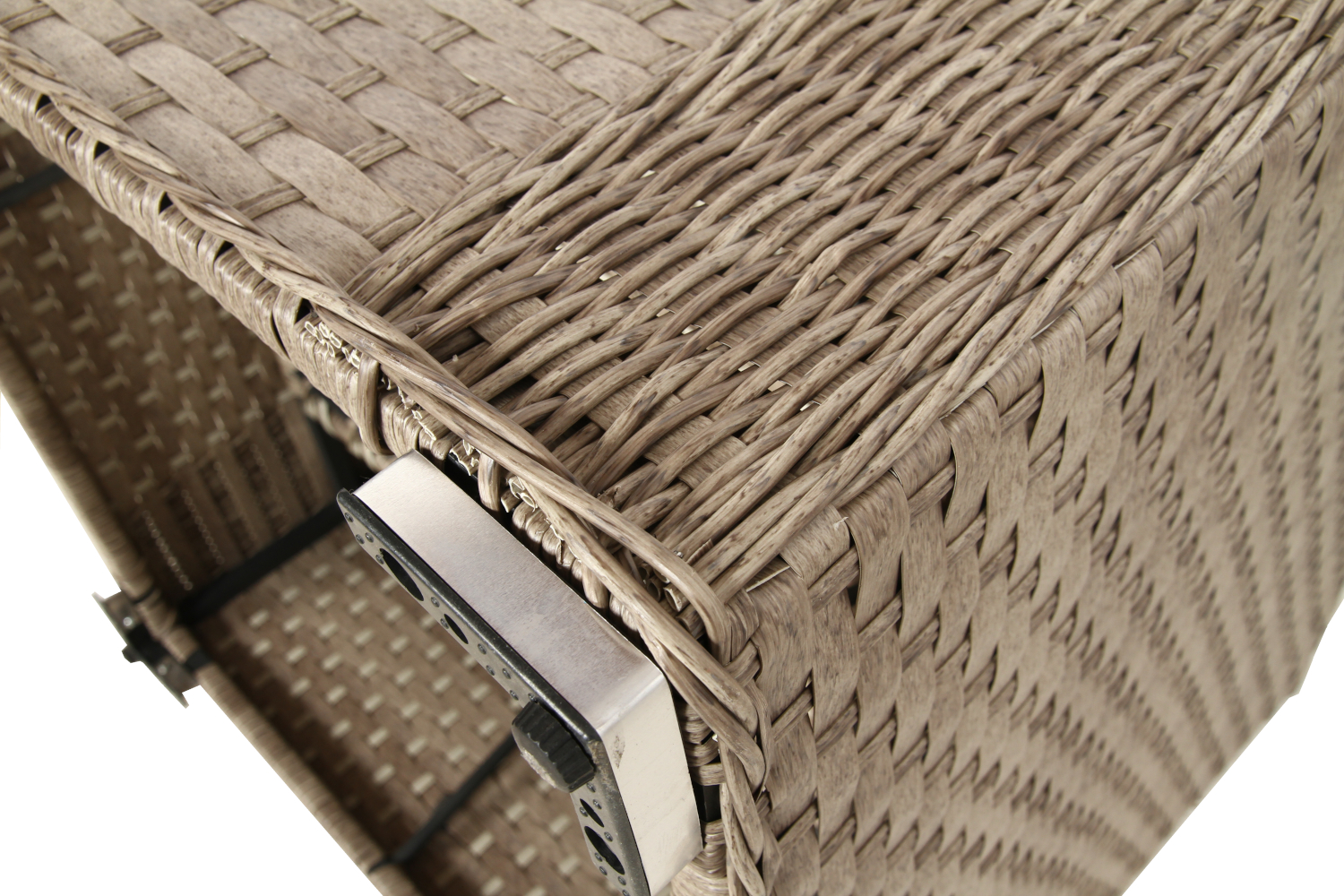 Technorattan, z którego wykonano meble, to nowoczesny materiał syntetyczny inspirowany naturalnym rattanem. W odróżnieniu od niego nie wymaga konserwacji, nie blaknie pod wpływem słońca i jest odporny na deszcz, śnieg czy zmiany temperatury. Dzięki temu zestaw może stać na zewnątrz przez cały rok.