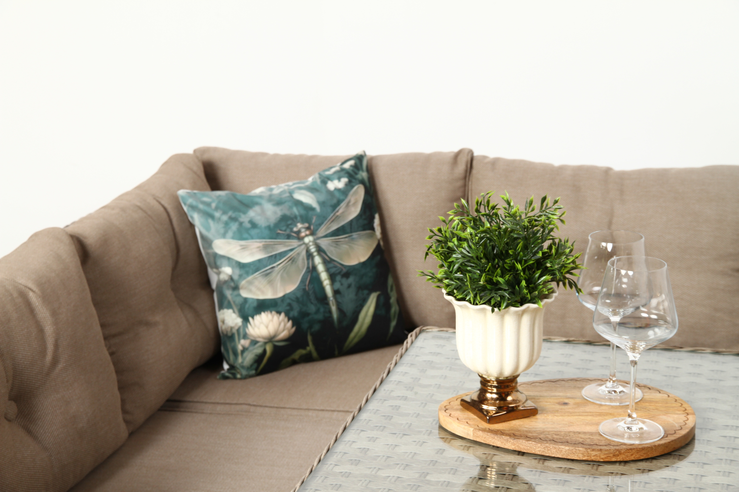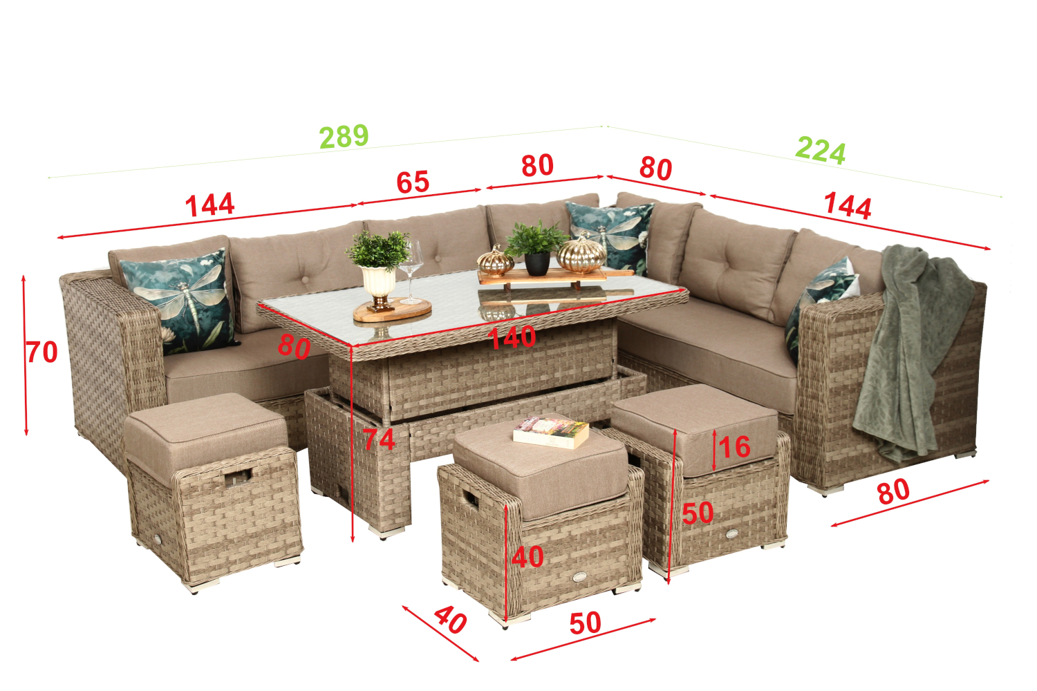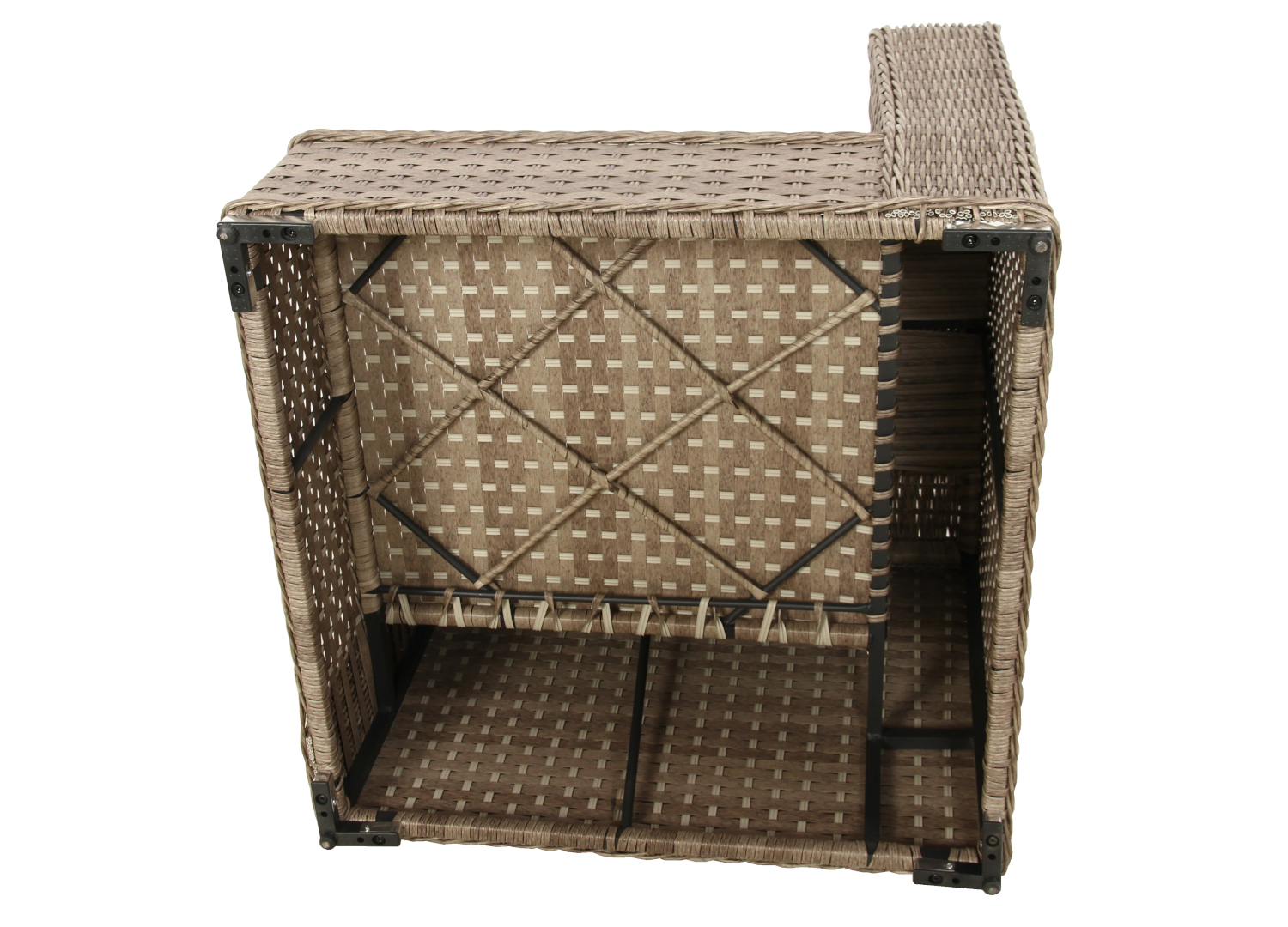 Technorattan, z którego wykonano meble, to nowoczesny materiał syntetyczny inspirowany naturalnym rattanem. W odróżnieniu od niego nie wymaga konserwacji, nie blaknie pod wpływem słońca i jest odporny na deszcz, śnieg czy zmiany temperatury. Dzięki temu zestaw może stać na zewnątrz przez cały rok.