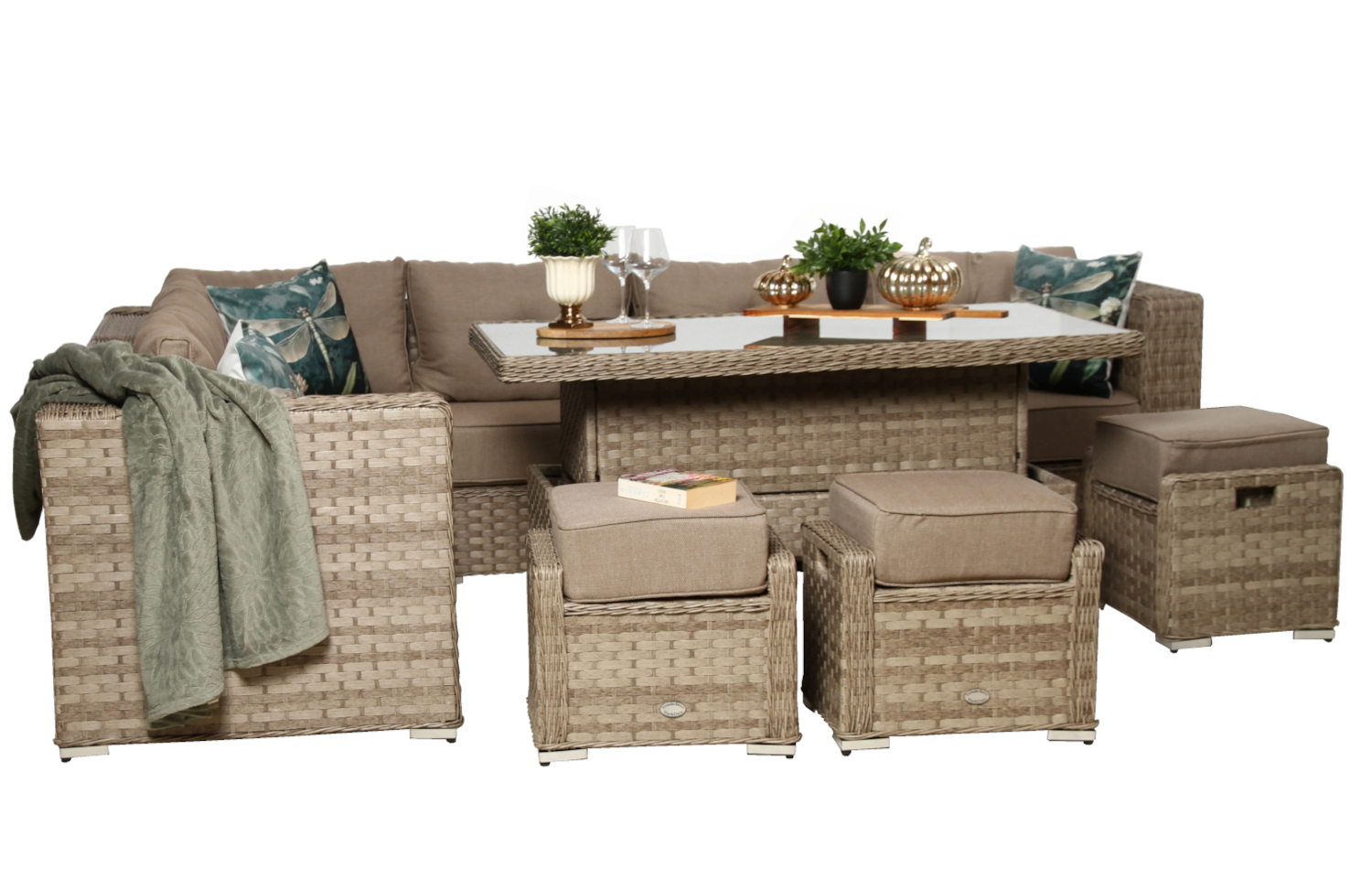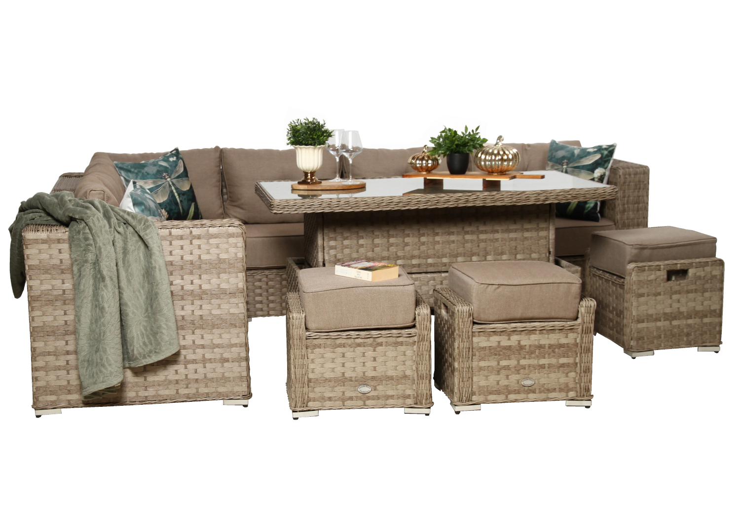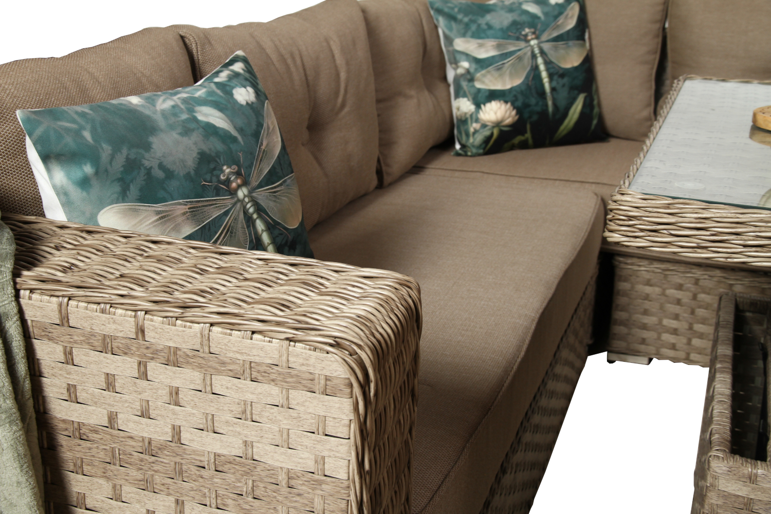 Zestaw mebli ogrodowych MANILA to system modułowy, co oznacza, że można go dowolnie konfigurować. Narożnik można ustawić zarówno po lewej, jak i po prawej stronie, co ułatwia dopasowanie układu do wielkości i kształtu przestrzeni.